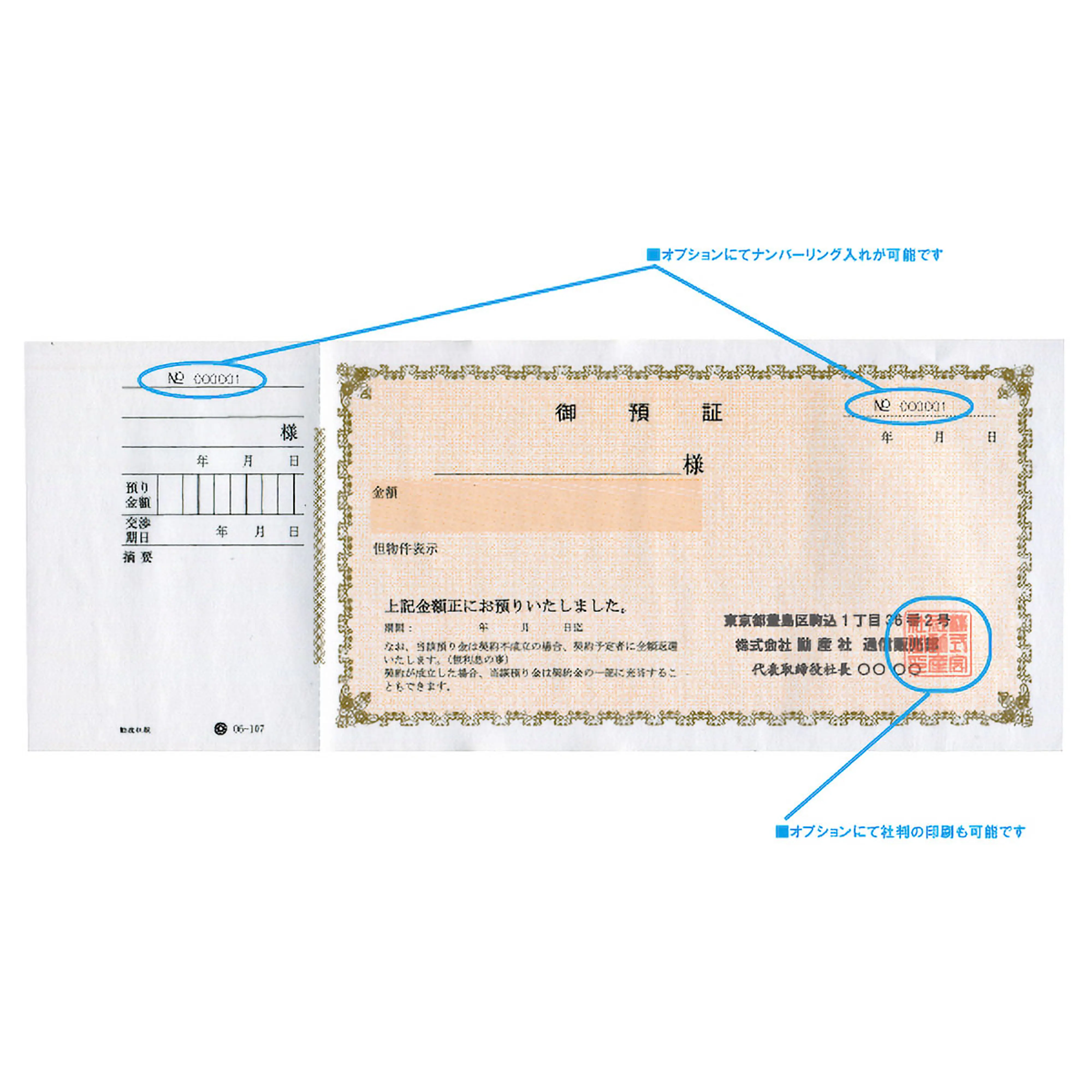 社判の印刷をご希望の場合、きれいに捺印したものを郵送にて弊社宛にお送りいただくか 捺印後、スキャナーで読み取りの際にPDFデータにて保存したデータをメールにてお送りください。ナンバーリングは通し番号に限り別途¥3,300