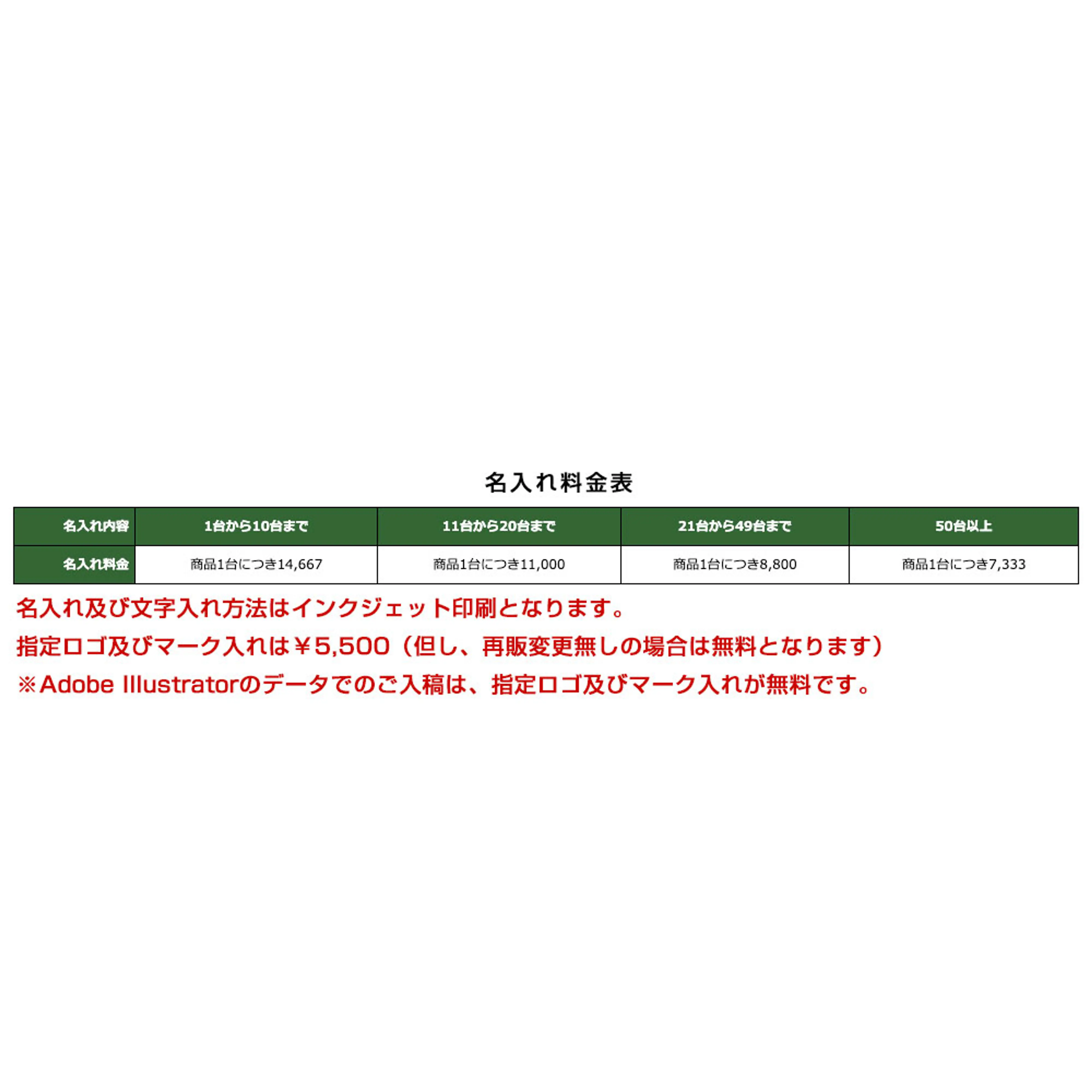 | 名入れ料金 | 商品1台につき14,667 | 商品1台につき11,000 | 商品1台につき8,800 | 商品1台につき7,333 |