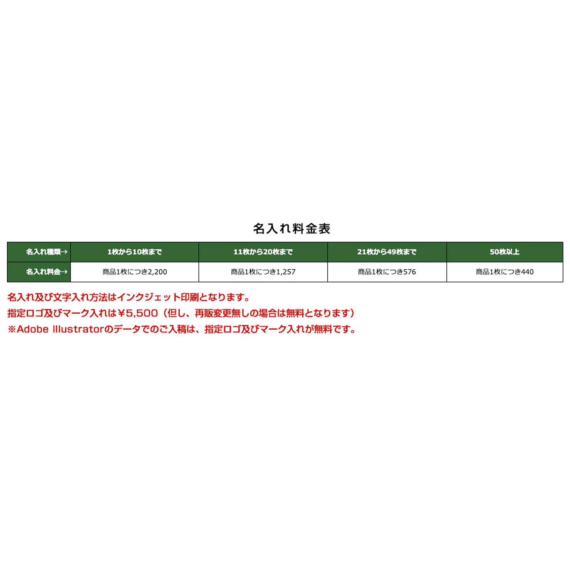 | 名入れ料金→ | 商品1枚につき2,200 | 商品1枚につき1,257 | 商品1枚につき576 | 商品1枚につき440 |