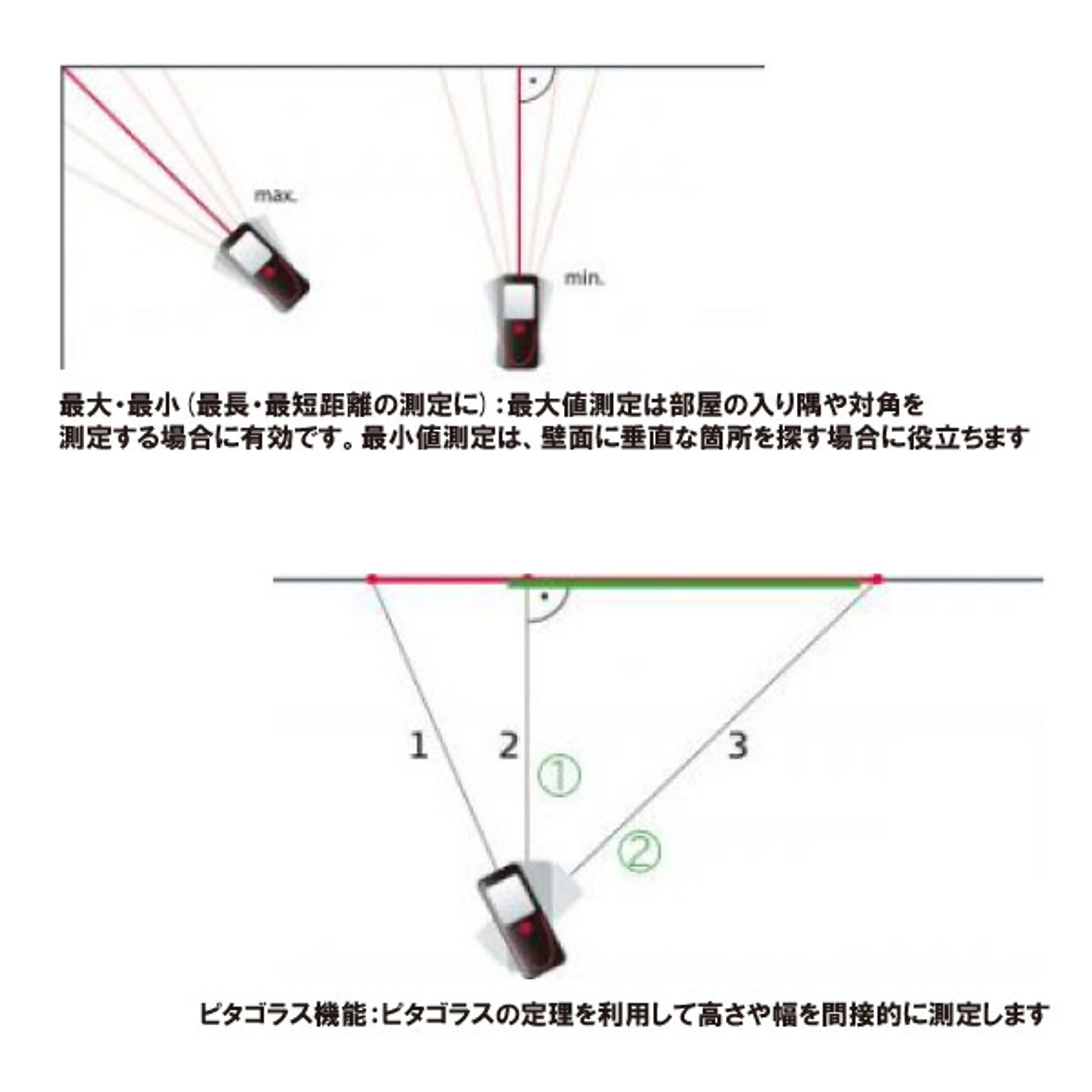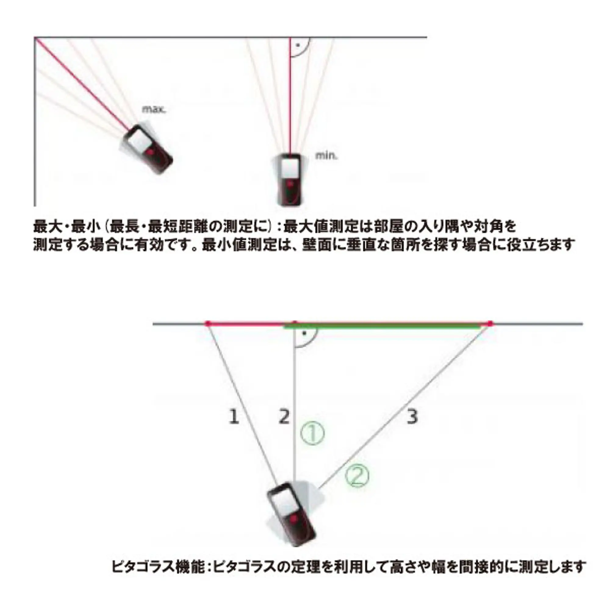 - ピタゴラス測定で、離れた場所からでも2ヵ所または3ヶ所の測定値により建物の幅や高さの測定が可能