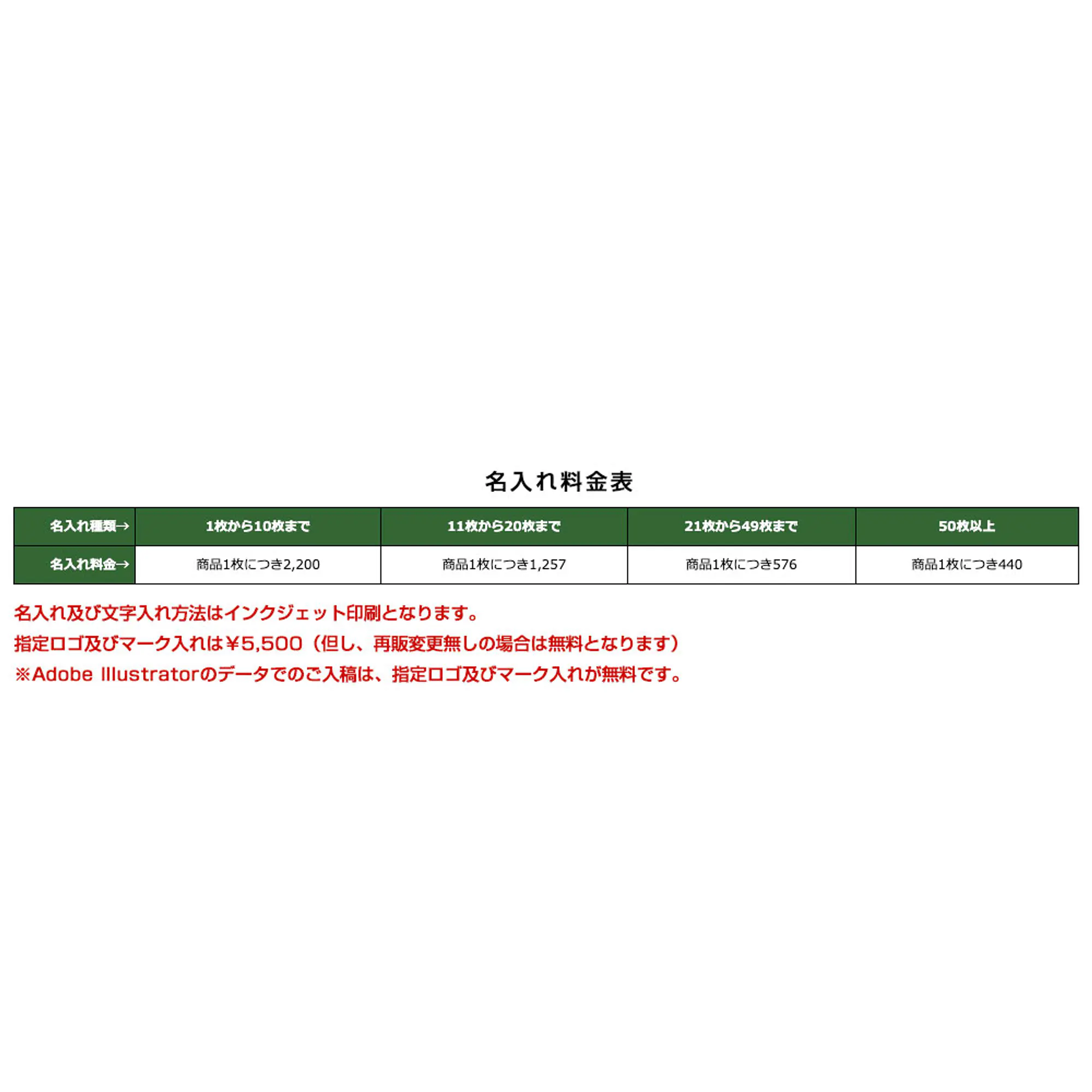 | 名入れ料金→ | 商品1枚につき2,200 | 商品1枚につき1,257 | 商品1枚につき576 | 商品1枚につき440 |
