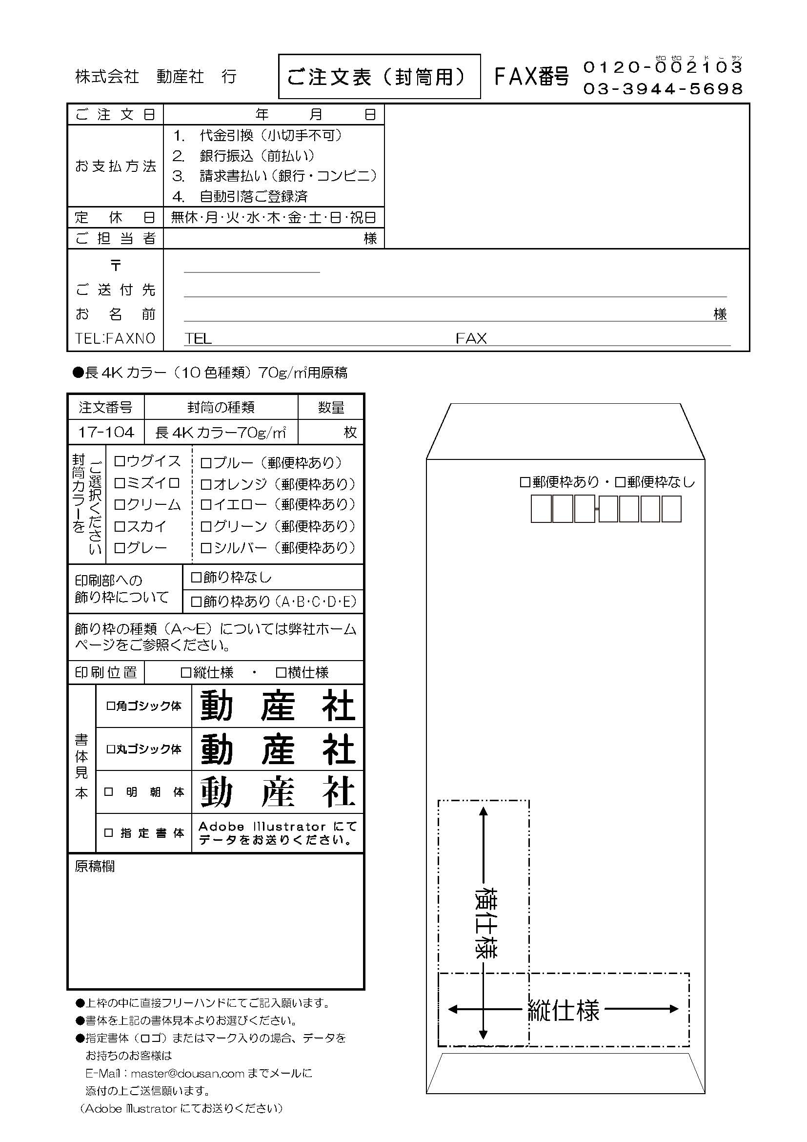 - 長4Kカラー封筒(用紙B5サイズ三折用)※封筒色の種類により郵便枠あり(赤)・枠なしがあります。