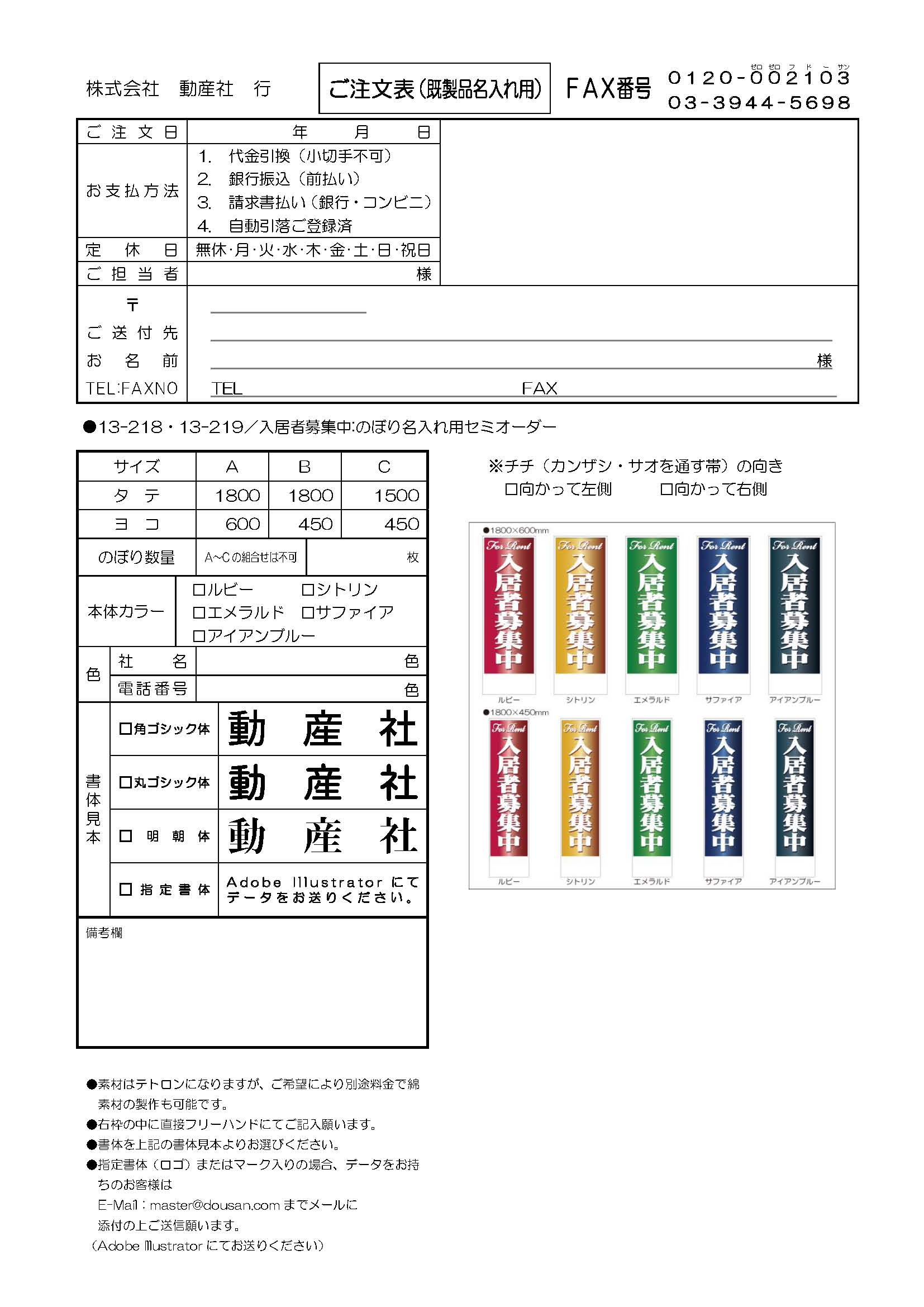 入居者募集中:のぼり名入れ用セミオーダー1800/1500×450mm