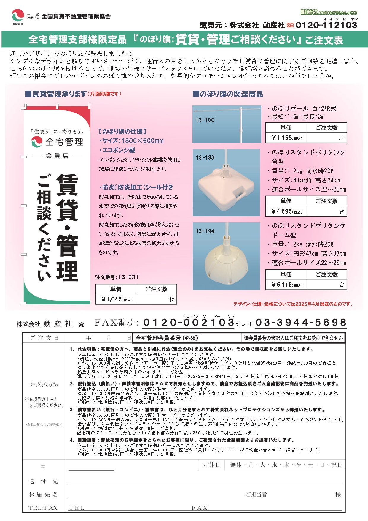 全宅管理会員様用のぼり旗:賃貸・管理ご相談ください