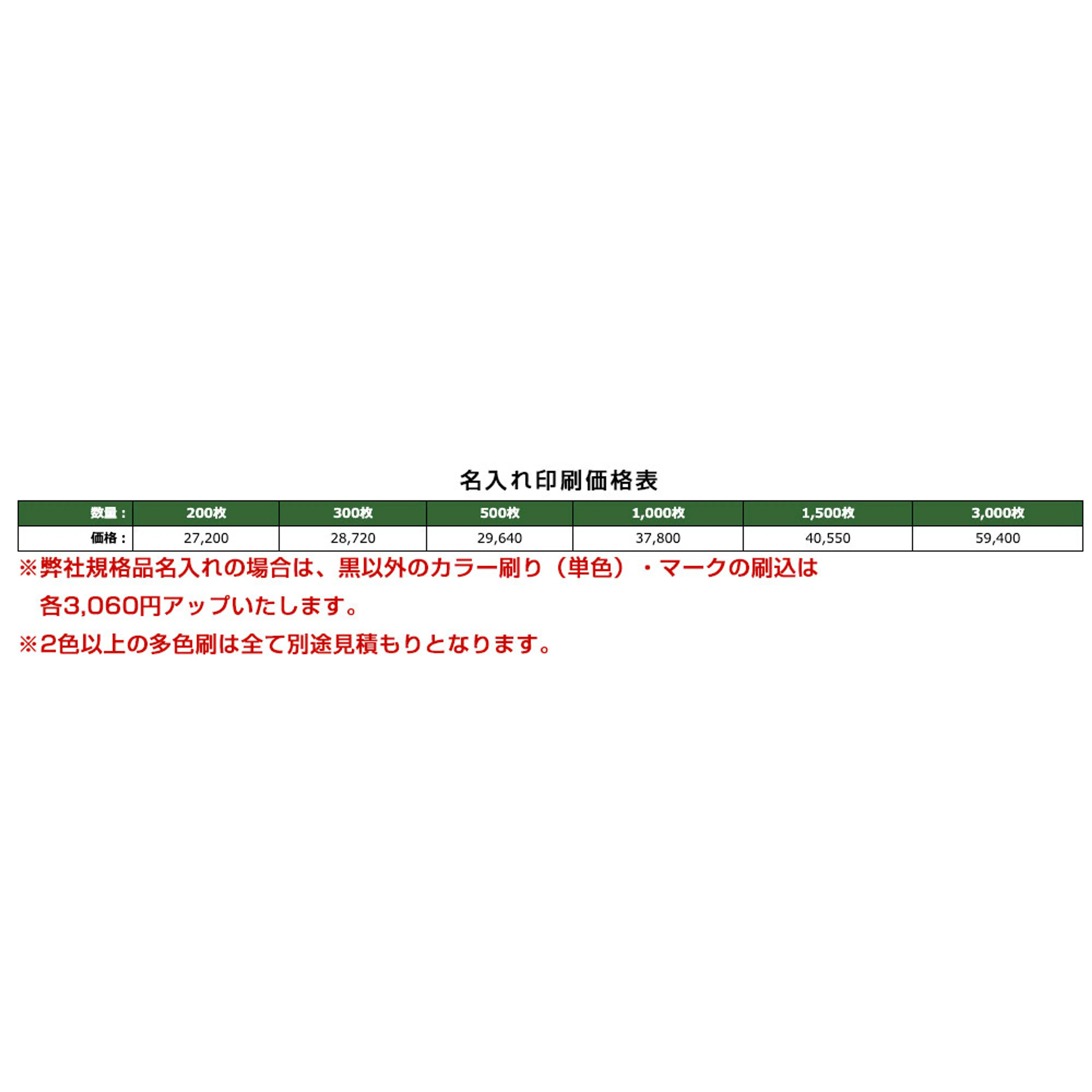※弊社規格品名入れの場合は、黒以外のカラー刷り(単色)・マークの刷込は各3,060円アップいたします。※2色以上の多色刷は全て別途見積もりとなります。