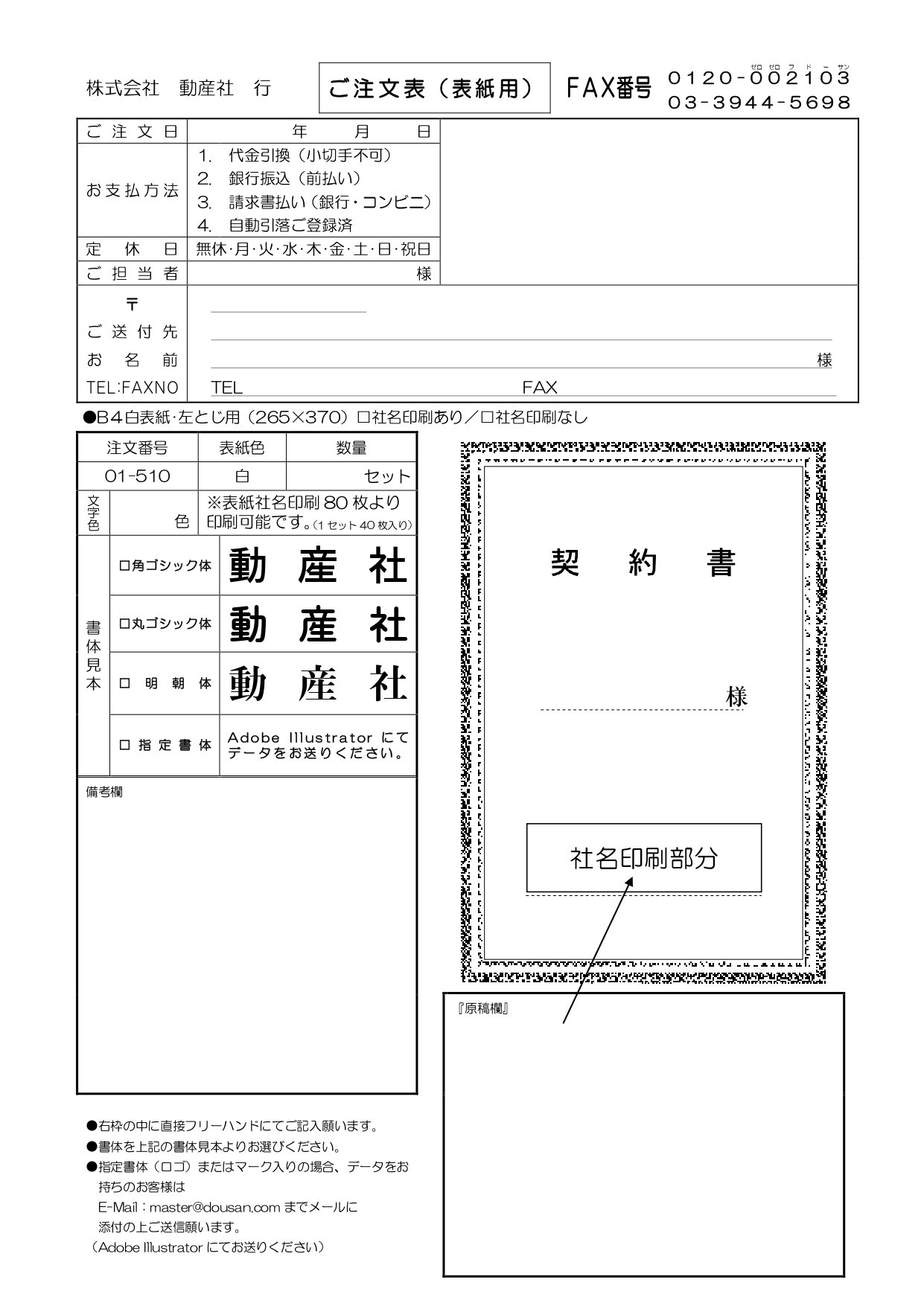 契約書 表紙:B4サイズ(白上質紙):1セット40枚入り