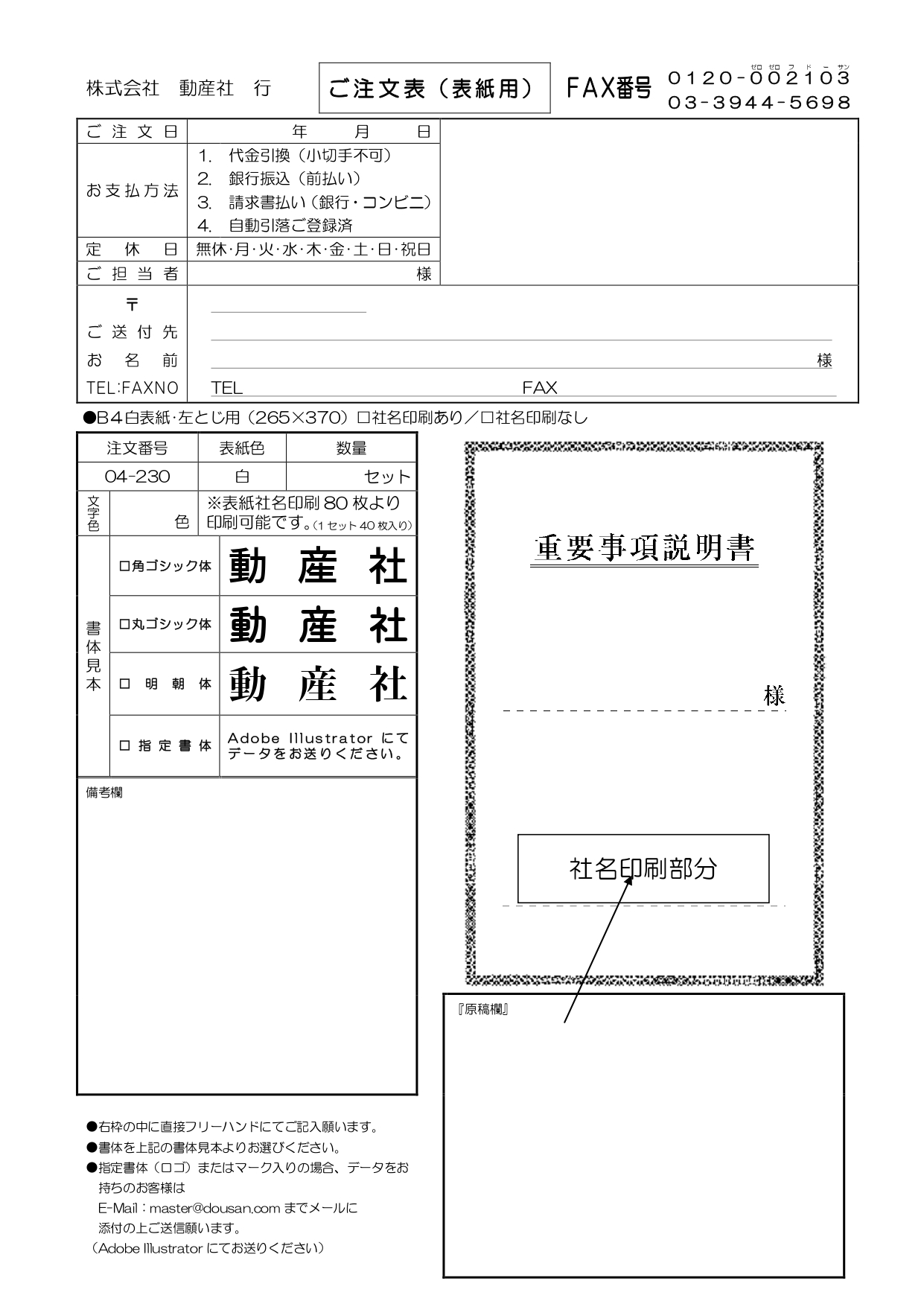 重要事項説明書 表紙:B4サイズ(白上質紙):1セット40枚入り