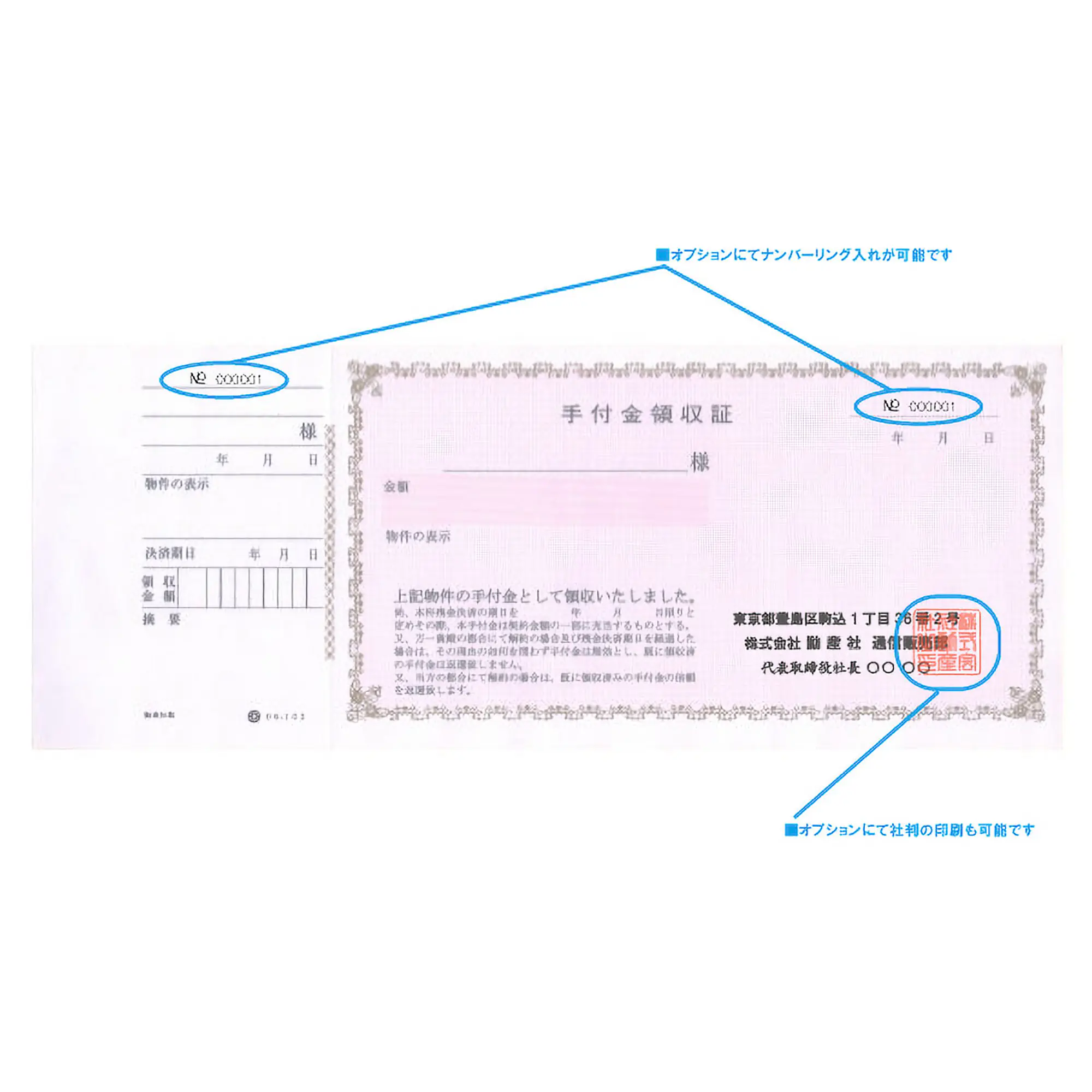 社判の印刷をご希望の場合、きれいに捺印したものを郵送にて弊社宛にお送りいただくか 捺印後、スキャナーで読み取りの際にPDFデータにて保存したデータをメールにてお送りください。ナンバーリングは通し番号に限り別途3,300円