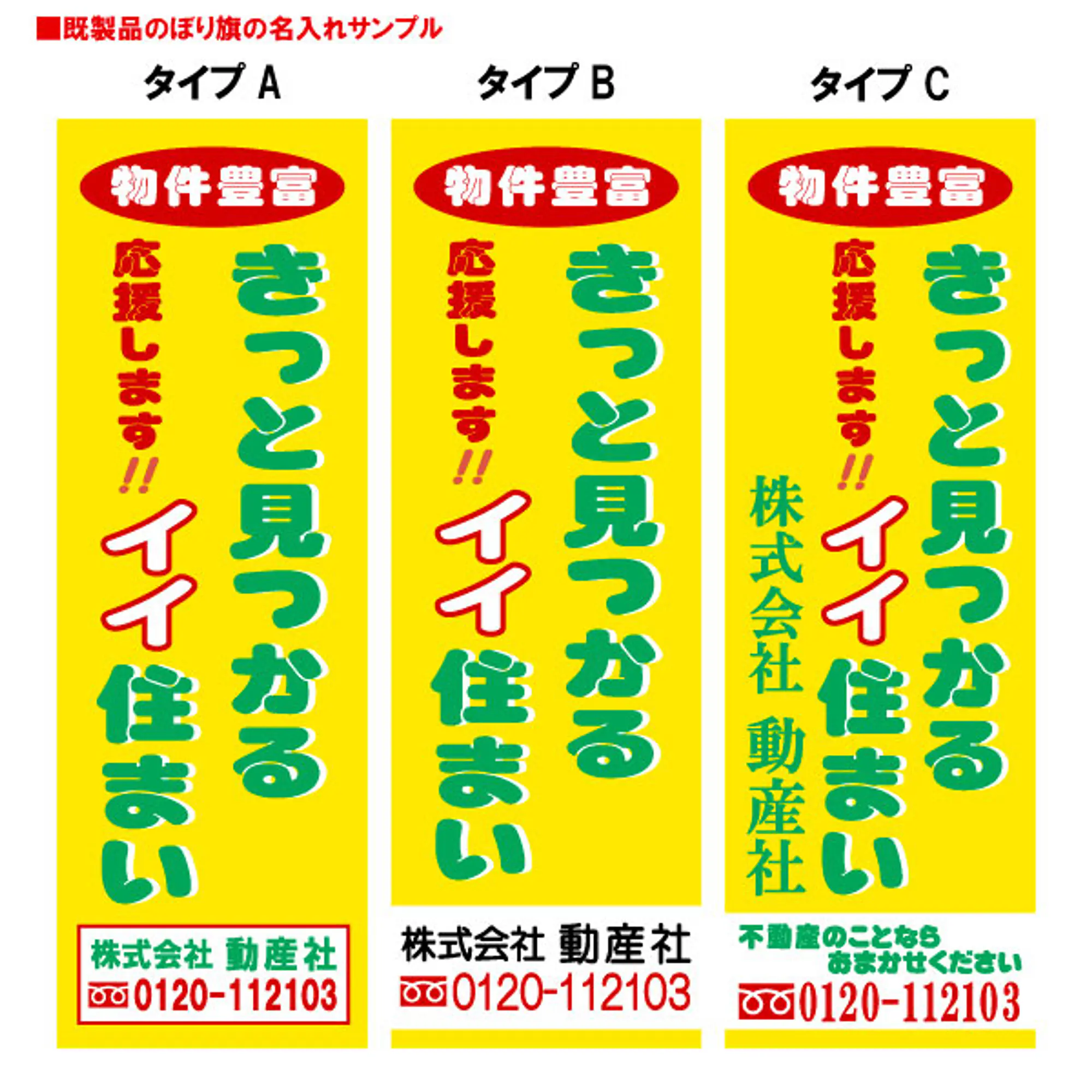 既製品のデザインに対し御社名・電話番号などをお入れし、のぼり旗を製作致します。