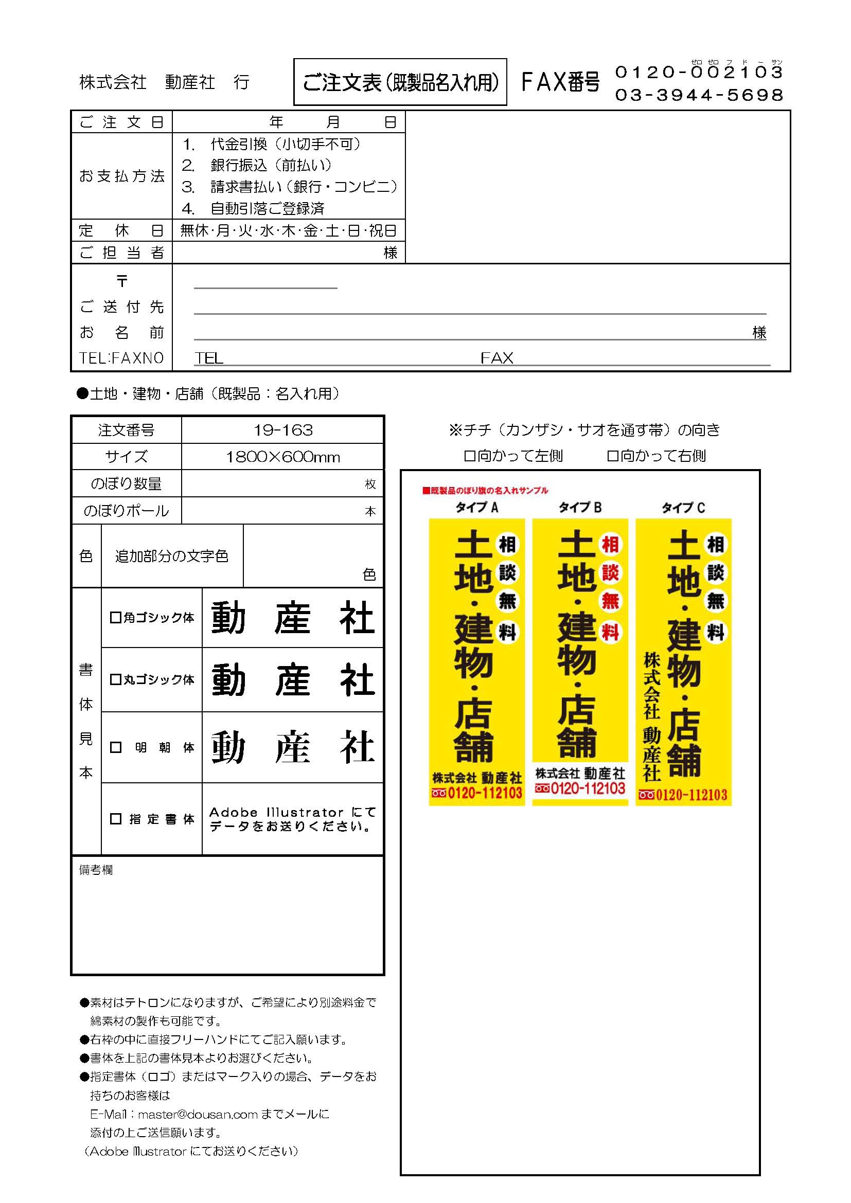 既製品のデザインに対し御社名・電話番号などをお入れし、のぼり旗を製作致します。