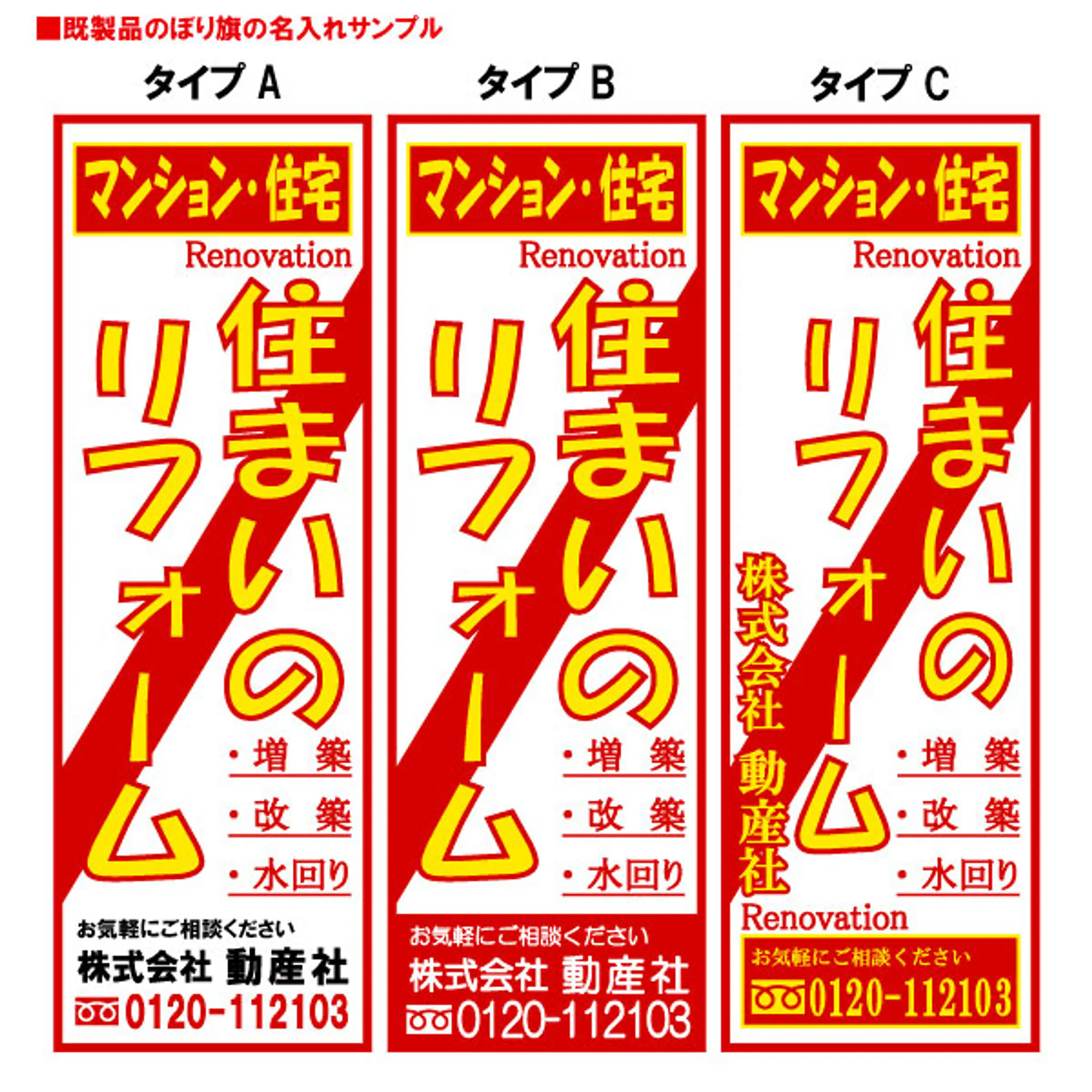 既製品のデザインに対し御社名・電話番号などをお入れし、のぼり旗を製作致します。