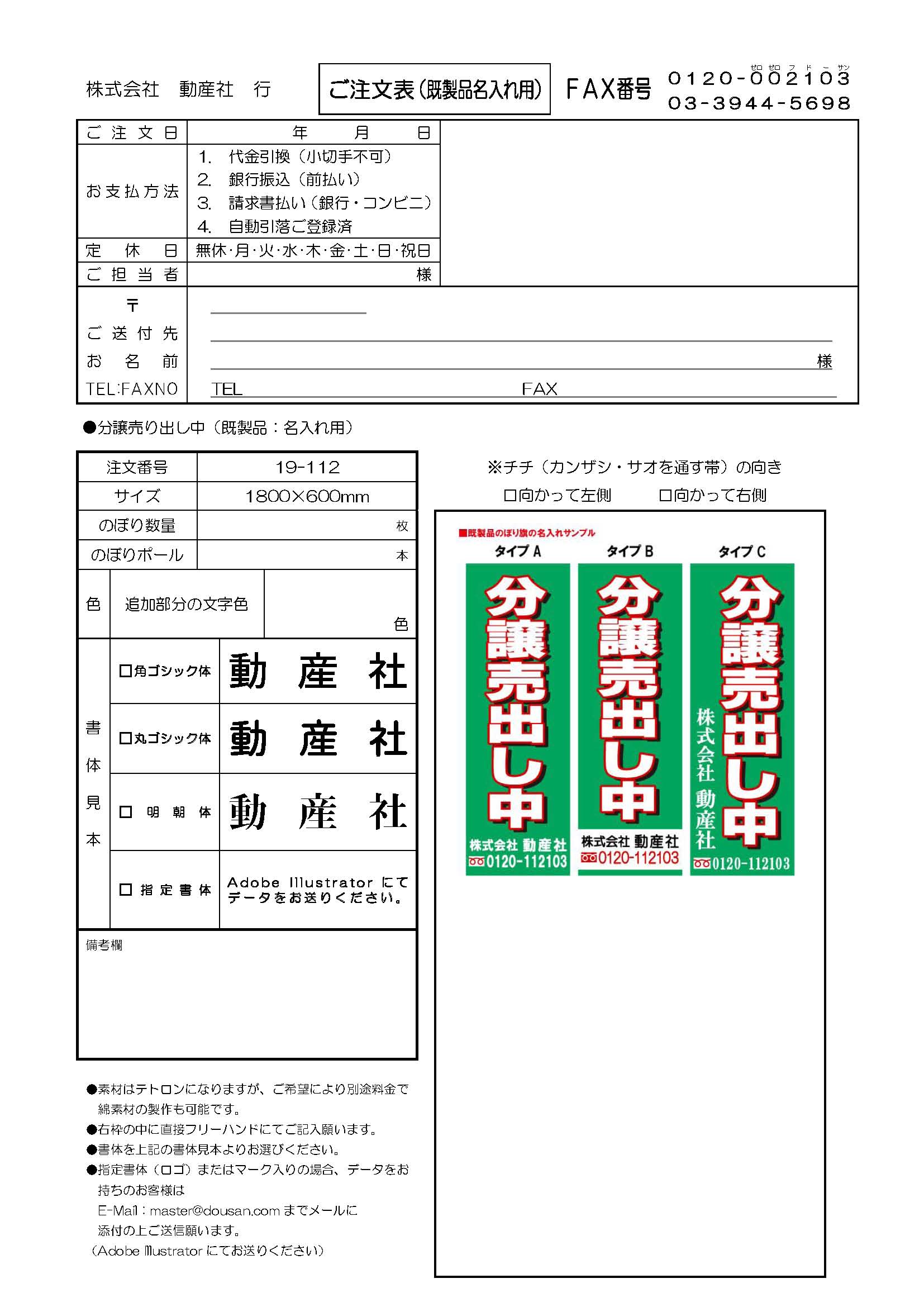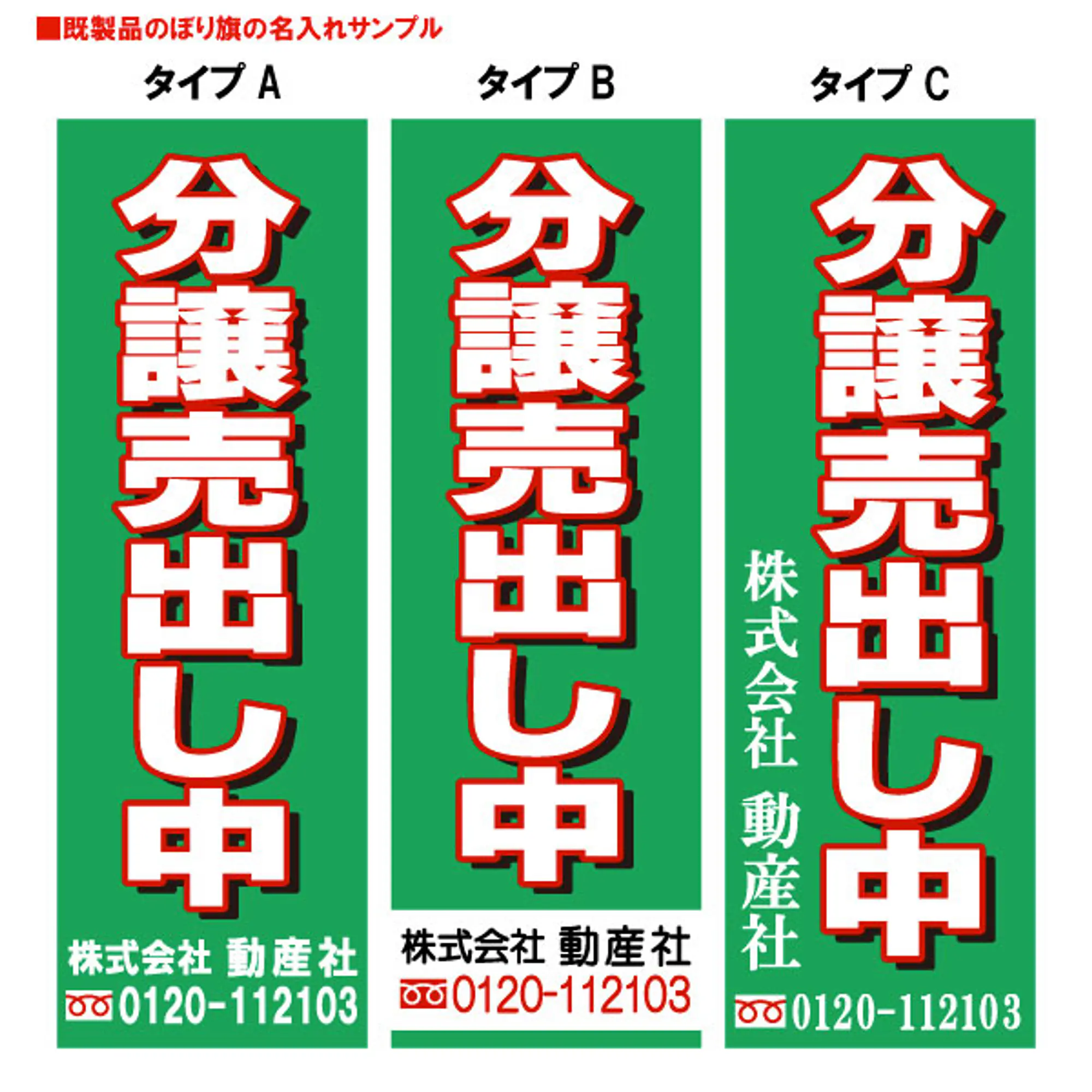 既製品のデザインに対し御社名・電話番号などをお入れし、のぼり旗を製作致します。