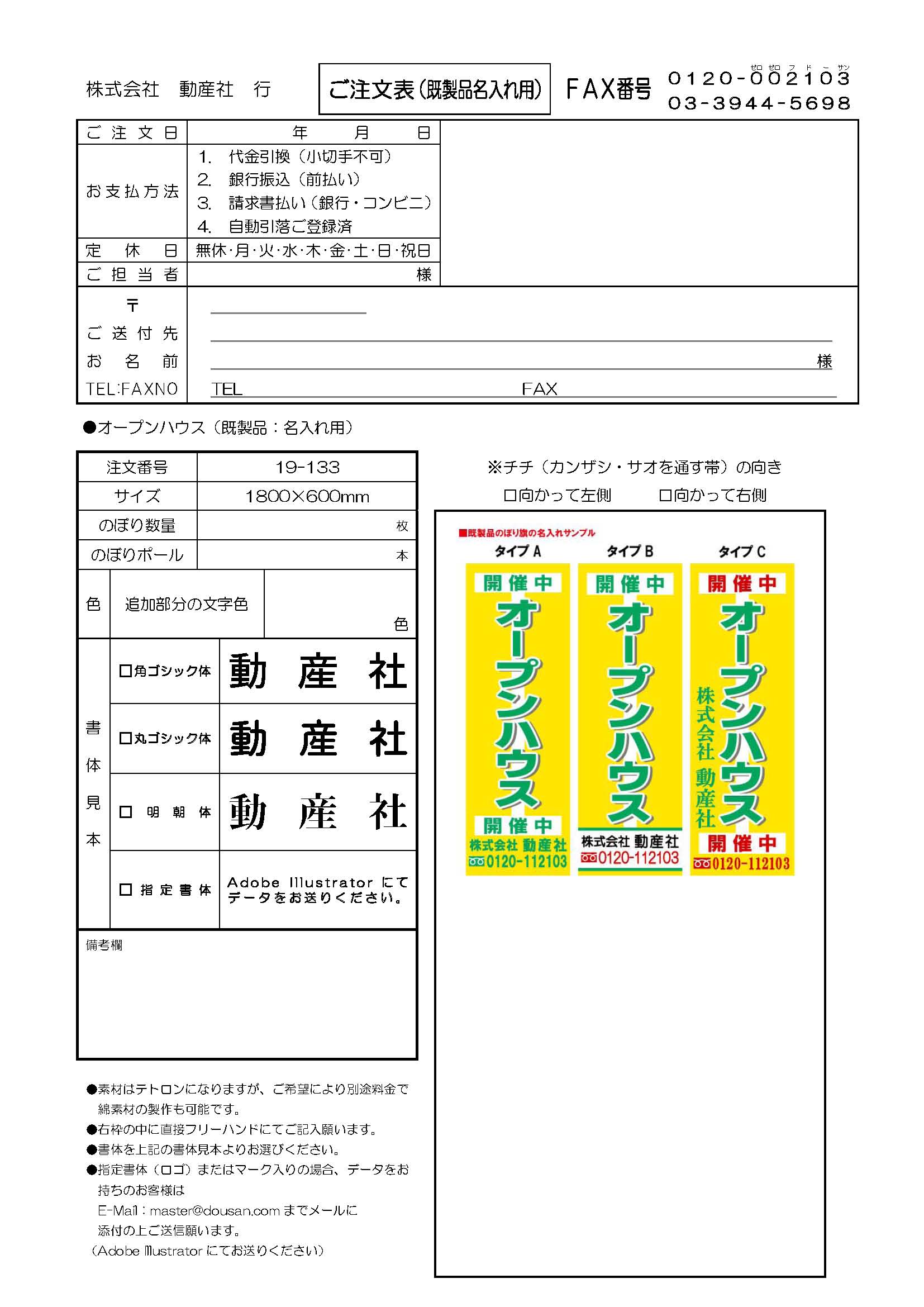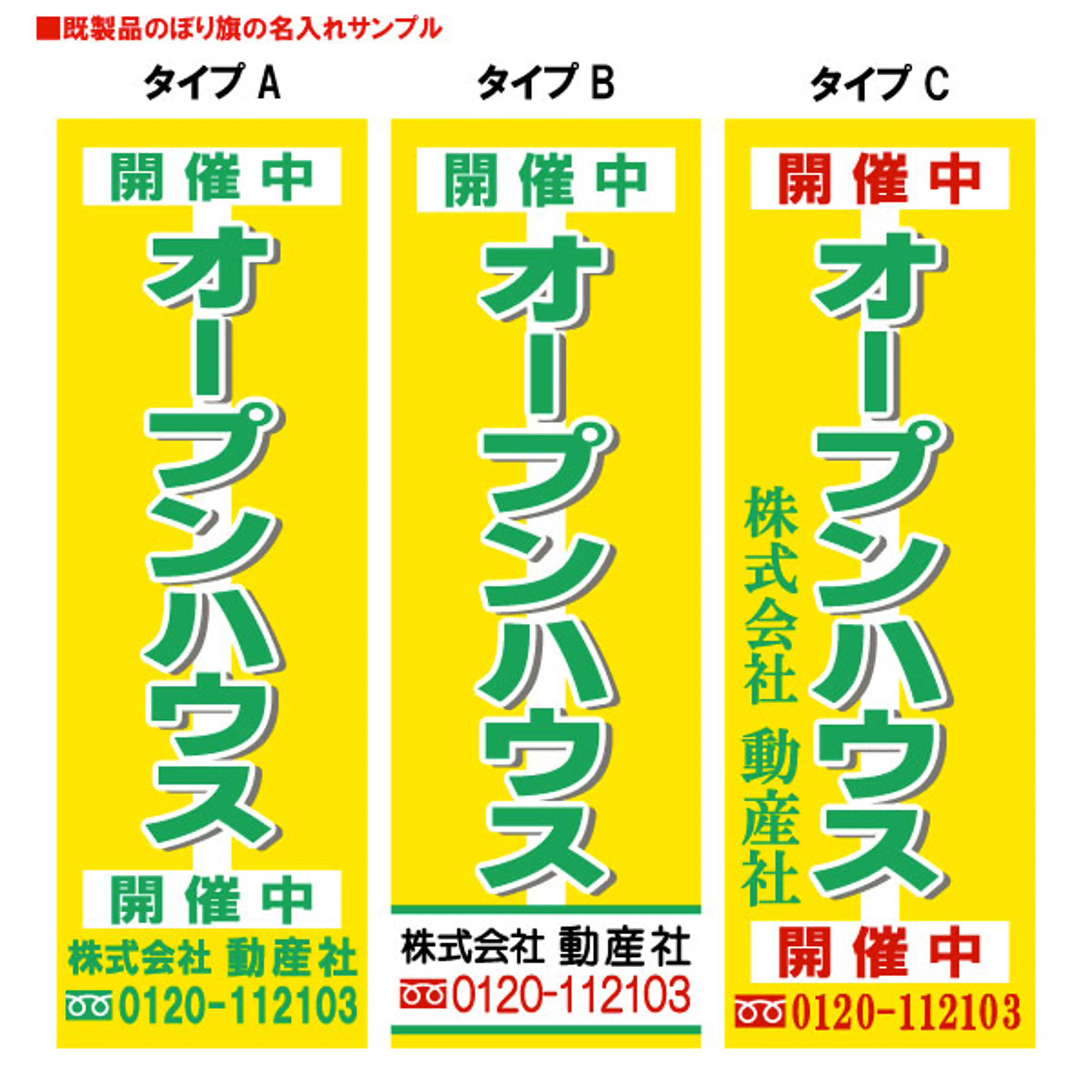 既製品のデザインに対し御社名・電話番号などをお入れし、のぼり旗を製作致します。