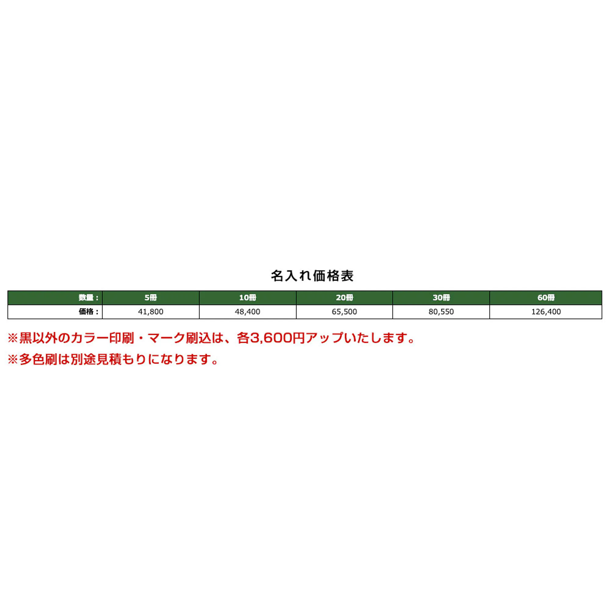 ※黒以外のカラー印刷・マーク刷込は、各3,600円アップいたします。※多色刷は別途見積もりになります。