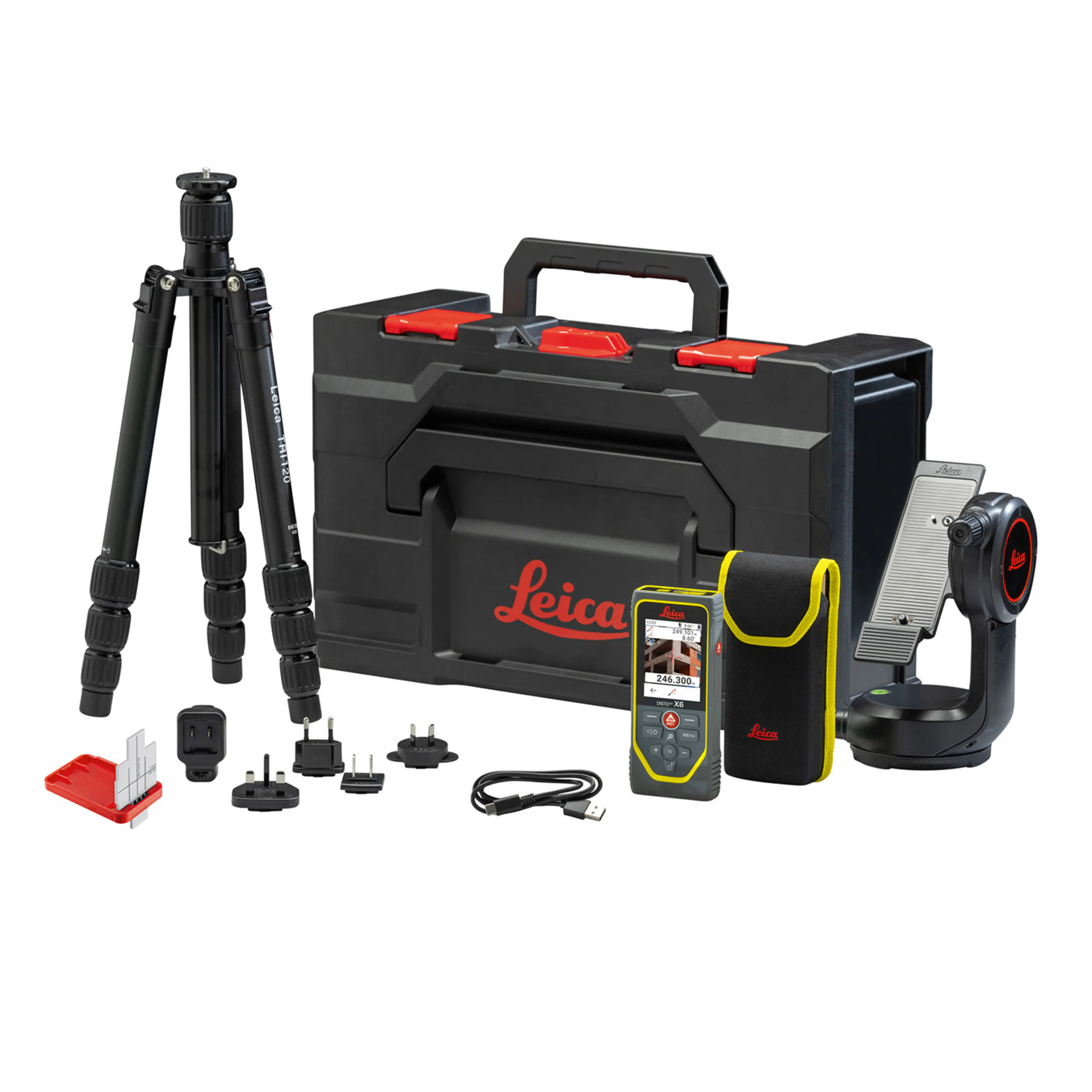 ライカディストX6本体、ディスト用アダプターDST360X、ディスト用三脚TRI120、GZM3ターゲットプレート、専用metaBOX、専用ストラップ、USBケーブル、USBチャージャー、取扱説明書(QRコード)、精度証明書(英文×2)